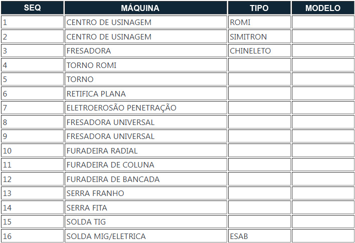 Tabela de Ferramentaria.